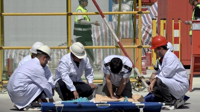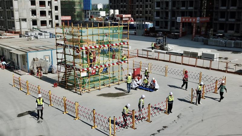 隨后,柳林路項(xiàng)目部開展火災(zāi),高處墜落應(yīng)急救援演練,本次演練模擬了施工區(qū)域突發(fā)火情,慌亂中導(dǎo)致工人雷某腳下失穩(wěn),從無防護(hù)缺口墜落。事故發(fā)生后,率先發(fā)現(xiàn)險(xiǎn)情的工作人員立即示警并上報(bào),現(xiàn)場立刻啟動(dòng)應(yīng)急預(yù)案,在出動(dòng)各應(yīng)急小組實(shí)施救援的同時(shí),緊急聯(lián)絡(luò)消防、公安、醫(yī)療單位,迅速、有序合力完成險(xiǎn)情處置。